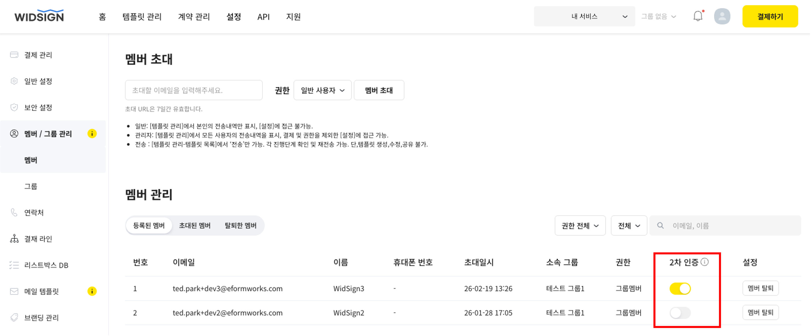- 설정이 활성화되면 초대된 멤버가 서비스에 이동할 때 이메일 인증번호 입력이 필요합니다.